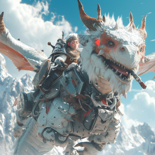 A militant dwarf girl on a cute in plate armor with a shield and an electric hammer flies into battle on a cute kind white dragon with a fluffy and spiked body over the icy mountains. 3d rendering. cyberpunk - INSIDE--ar 2:3 --v 6.0