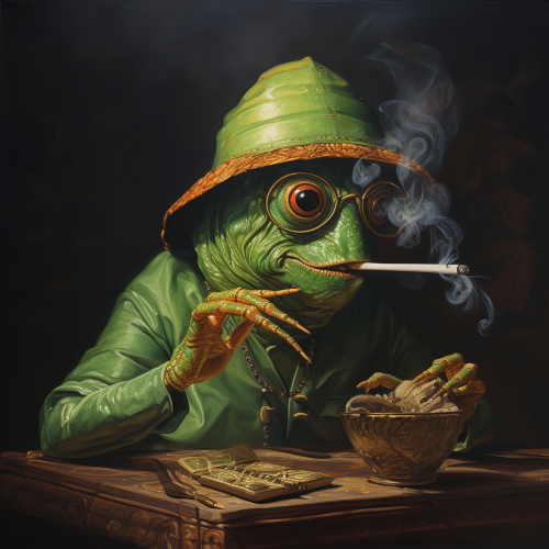 cockroach with a glowing green hat on, gold ring on tarsus, smoking a cigar, oil painting