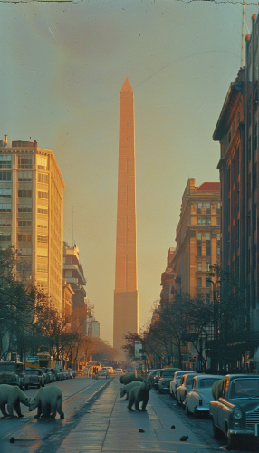A photorealistic image of the obelisk of Buenos Aires, with three polar bears in the middle of the street. Light pastel colors, ethereal light, a bit out of focus --ar 4:7 --sref 3840558885 --v 6.0 --s 250
