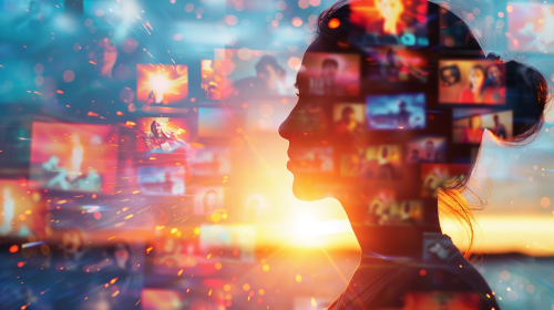 A double-exposure composite image of a human silhouette blended over a screen with numerous streaming services. This overlay is a visual metaphor that life is a scene in many movies. The silhouette is backlit with a bright light reminiscent of a sunrise or sunset, symbolizing the beginning of change. --ar 16:9 --v 6.0 --style raw