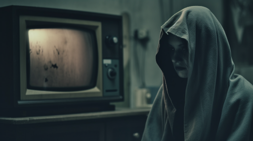 Dying hoodie girl watching her life on a screen