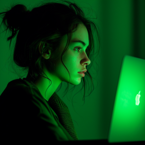 over the shoulder shot of a woman in front of an entirely green macbook screen --v 6.0