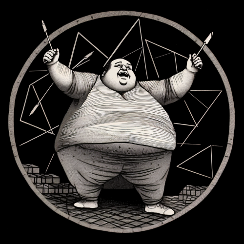a black and white line drawing of a fat man contorting around arrows being shot at him
