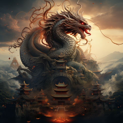 a Chinese New Year poster showing a dragon flying on top of a daoism temple sitting on mountain top --s 250
