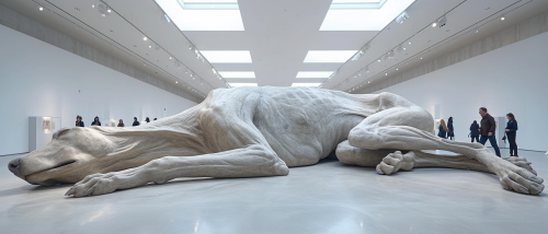 Create a series of hyper-realistic images in a wide 21:9 aspect ratio, showcasing large dog sculptures in the style of Ron Mueck. Each sculpture should depict a different breed of large dog, like a Great Dane or Mastiff, captured in a peaceful sleeping pose. Set these sculptures in a spacious, white museum environment, emphasizing the grand scale of the artwork. Include a few scattered museum attendees in each image to provide a sense of scale and to highlight the impressively large size of the sculptures. The museum space should be minimalist, with bright, even lighting to enhance the hyper-realistic quality of the dogs and to cast soft shadows that accentuate their lifelike features. Focus on the texture of the fur, the relaxed poses, and the serene expressions of the sleeping dogs, creating a contrast between the lively presence of the attendees and the tranquil repose of the sculptures. --ar 21:9 --s 1000 --v 6.0 --style raw