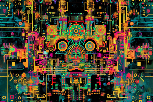 mayan aztec design hieroglyphic circuit board digital tribalism design, bold psychedelic schematic, colorful, intricate, avant-garde --ar 3:2 --v 6.0