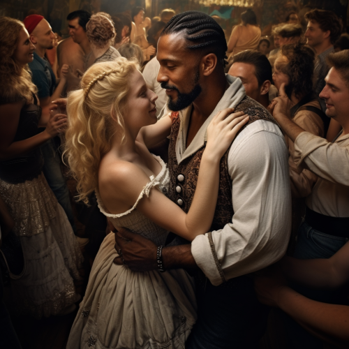 a poster featuring a brazilian german couple dancing salsa, wearing lederhosen at oktoberfest, salsa vibes, art deco influence, vintage cut-and-paste, animated, historical imagery