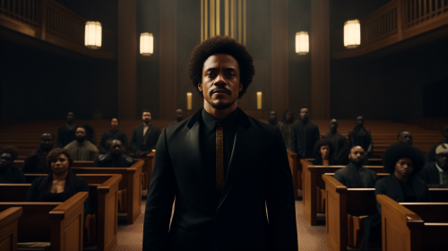 Cinematic still , zealous, , short Afro hair, bold,pastor wearing a black suit standing on the pulpit staring at African American congregation --ar 16:9 --v 5.2