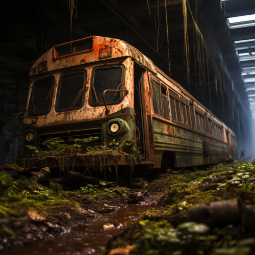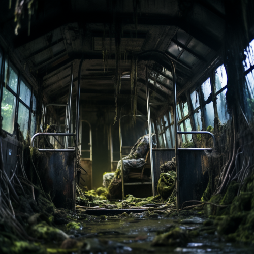 an underground shuttle in a dystopian world eaten away by acid rain. Perspective is inside the shuttle. Focus on Unwell teenage boys are high on drugs and household chemicals. Violent, ugly, pale, unfriendly, lawless. Photo real.
