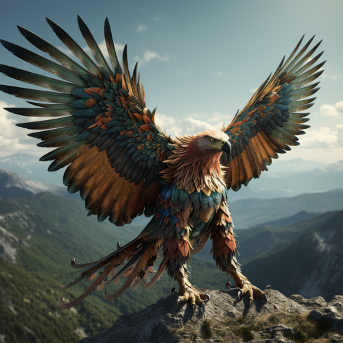 A majestic and aggressive eagle, protector of Rome, emerging from a Roman temple. He must be holding a javelin in his wing. The colours must be yellow and purple. There shouldn't be much detail.