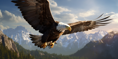 Design a slot symbol featuring a soaring bald eagle, side profile, with a semi-realistic look and simple game art style. The bald eagle should be rendered with clean lines and rich colour tones, emphasizing its strong features. The bald eagle should show lighting highlights from a setting sun. High contrast. 8k. The background should be white background. --v 6.1