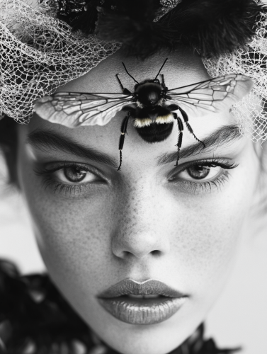 Hyperrealistic and highly detailed black and white portrait of a severe and tough 19th century queen, dressed and styled according to the fashion of the time. A a bumblebee is perched on her nose, showing us the top-down view of the symmetric bumblebee. Irving Penn style of photography. Focus on the extreme realism of the skin, highlighting visible pores, fine lines and the thin folds of the lips as the central elements of the image. Perfect image like a photo. The texture of the skin and the details are of paramount importance, shot on Hasselblad, with a 85mm lens --ar 3:4