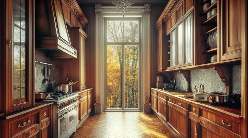 create a kitchn from 19th century, wide view window in centre kitchen assecories, antique style, classic collage, in the style of europian houses brown theme, 4k post-processing highly detailed arch,ar 16:9 --chaos 20 --ar 16:9 --stylize 1000 --weird 900 --v 6.1
