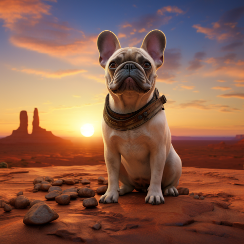 A french bulldog, standing in the desert, at dawn. Theme: Pixar.