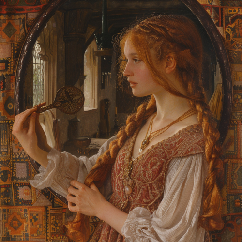 Depict the scene in Edmund Blair-Leighton's early medieval style: Eleanor May Tomlinson braided her red hair, clasped it on top of her head with a gold clasp, and put her good gold brooch into the fold of her cloak and her moonstone necklace.. She looked at herself in the old bronze mirror inside her early medieval adorned chambers in a castle