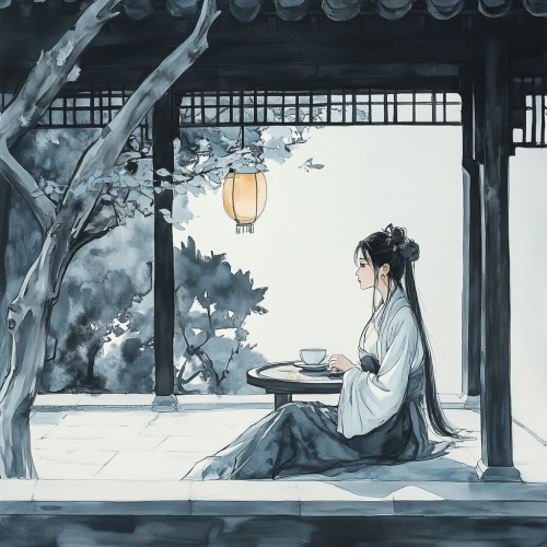 Chinese traditional scene, modern Chinese gongbi painting,A girl wearing ancient Chinese Song Dynasty clothing sat in an outdoor pavilion drinking tea, hand drawn style, gongbi painting, minimalism, complex details, movie lighting, high-definition