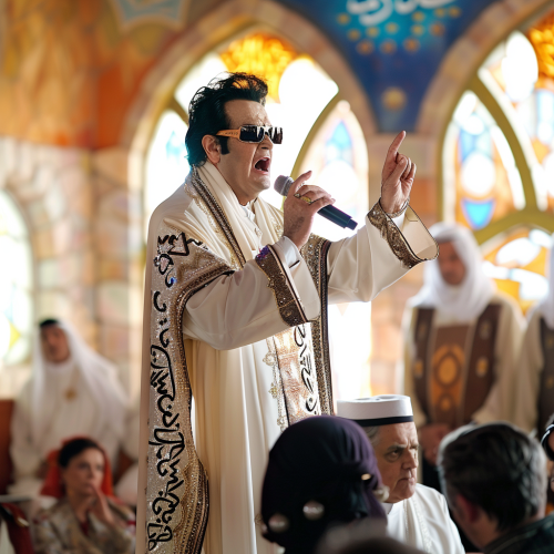Elvis impersonator dressed like a priest in an Arabian-style church, he is seen proudly preaching to a congregation of middle-eastern people