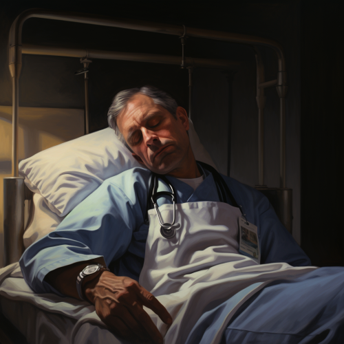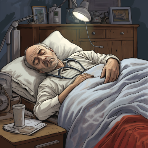 exhausted resident physician fast asleep on a bed with his pager at his side. Looking exhausted with his mouth open and snoring. Drawn as a children’s book illustration