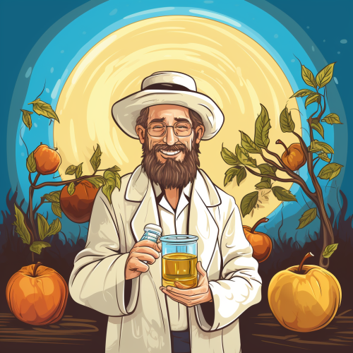 happy new jewish year card with a medical physict wearing a white wrobe and holding an apple and honey jar