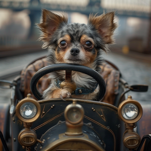 A whimsical photograph features a small Chihuahua with a white and grey coat, seated in a vintage black toy car with round headlights and a chrome grille. The dog's head is peeking out of the car, full positioned slightly to the right of center, with its large, upright ears and expressive dark eyes looking directly at the camera, giving it a determined and focused expression. The car's interior is lined with brown leather or vinyl upholstery, and a visible steering wheel with a chrome rim adds to its vintage charm. The vehicle's details are highlighted by soft, natural lighting, emphasizing its polished surface and intricate components. The car sits on a cobblestone street, with individual stones clearly visible and arranged in a herringbone pattern. In the background, there are blurred architectural elements such as columns and building facades, suggesting an urban setting. The overall mood of the image is playful and nostalgic, enhanced by the shallow depth of field that keeps the focus on the dog and the car while creating a bokeh effect in the background. The color palette consists of muted tones, including charcoal black, light brown, beige, and grey, contributing to the vintage feel. --s 750 --v 6.0