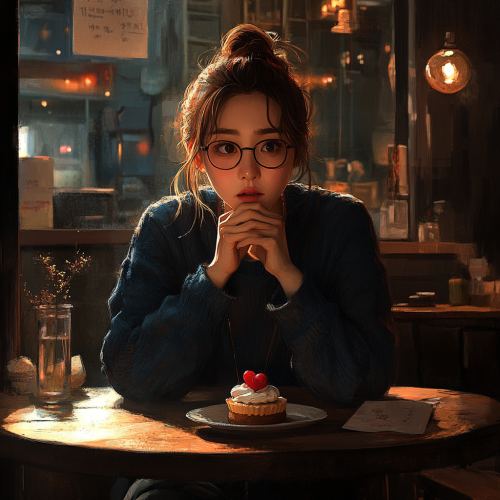 A Korean woman sitting at a table in a cozy cafe, staring at a tempting dessert in front of her with a conflicted expression. Her hands are clasped together as she debates whether to eat it, the cafe bathed in warm, soft lighting, creating an inviting yet challenging atmosphere.