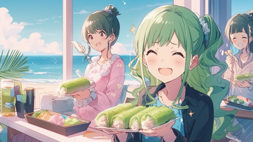 a group of cute girls with green hair eating sushi topped with huge green realistic sparkling plump bumpy goya and bitter cucumbers in a cute cafe in front of the beach of okinawa, clear blue sky, makoto shinkai --ar 16:9 --niji 5 --style cute