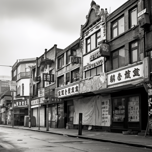 black and white, stark, realistic, run-down manchester chinatown, with boarded up shops, massage parlours