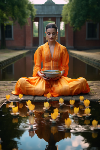 long shot photo of an eccentric traditional indian lady saint with saffron outfit, placing a lotus shaped bowl of fire in water, haute couture, symmetry, colorful palace gardens, river with bowls of fire, summer, pastel colors --ar 2:3 --v 5.2