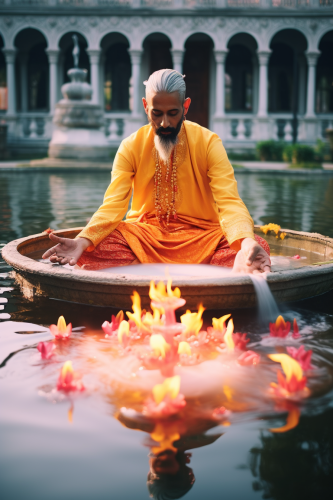 long shot photo of an eccentric traditional indian saint with saffron outfit, placing a lotus shaped bowl of fire in water, haute couture, symmetry, colorful palace gardens, river with bowls of fire, summer, pastel colors --ar 2:3 --v 5.2