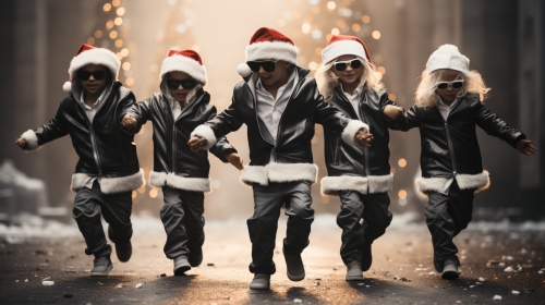 Eccentric and quirky children having a dance party while dressing up as Santa. Festive stage backdrop. They are meticulously posed and positioned in a minimalist symmetrical setting. Black and white with vibrant color splash. Vibrant hues. Tapestry of whimsy. nostalgia with a dash of quirky charm. Shot with a Pentax. K - 3 III Monochrome. Santa hats. Christmas tree in background. Presented in abstract expressionist art style. Extreme close - up camera angle. Very close. Low angle camera shot. Looking straight up, Blurred background. Bakeh elements. High - end. Very Stylish. Black and white photograph. --ar 16:9 --q 0.5 --s 750