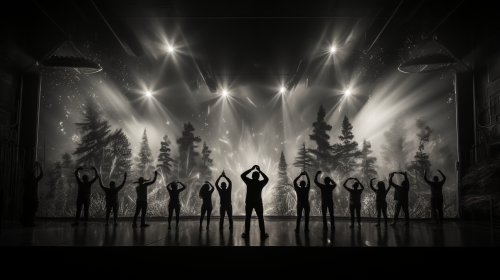 Eccentric and quirky people having a New Year’s Eve dance party. Festive stage backdrop. They are meticulously posed and positioned in a minimalist symmetrical setting. Black and white with vibrant color splash. Vibrant hues. Tapestry of whimsy. nostalgia with a dash of quirky charm. Shot with a Pentax. K - 3 III Monochrome. Presented in minimalist art style. Extreme close - up camera angle. Very close. Low angle camera shot. Looking straight up, Blurred background. Bakeh elements. High - end. Very Stylish. Black and white photograph. --s 750 --ar 16:9 --q 0.5