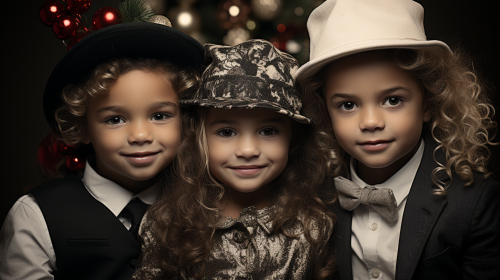 Eccentric and quirky children playing dress up with adult Christmas outfits. Festive stage backdrop. They are meticulously posed and positioned in a minimalist symmetrical setting. Black and white with vibrant color splash. Vibrant hues. Tapestry of whimsy. nostalgia with a dash of quirky charm. Shot with a Pentax. K - 3 III Monochrome. Santa hats. Christmas tree in background. Presented in Bauhaus art style. Extreme close - up camera angle. Very close. Low angle camera shot. Looking straight up, Blurred background. Bakeh elements. High - end. Very Stylish. Black and white photograph. --ar 16:9 --q 0.5 --s 750