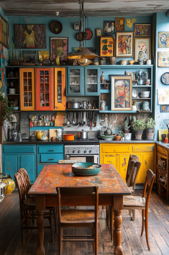 Eclectic kitchen with colorful, organized decor and vibrant atmosphere.