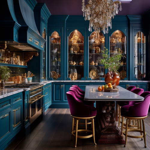 Visualize a colorful eclectic small cabin interior kitchen with brightly painted cabinets, mismatched chairs, and a variety of colorful textiles. Include unusual light fixtures and a diverse mix of patterns and materials. The decor should be bold and vibrant, reflecting a joyful and creative spirit. The kitchen should be tidy but full of life, showcasing an eclectic style. Photograph the kitchen to capture its playful, artistic atmosphere. Neat and organized. Camera: DSLR - Canon EOS 5D Mark IV. Lens: Canon EF 24-70mm f/2.8L II USM. Composition: Wide shot, room-centered, horizontal orientation, balance between furniture and space. Film: Digital, high resolution, color profile sRGB. Camera settings: ISO 400, f/2.8, 1/60 sec. --ar 2:3 --v 6.1 --s 250