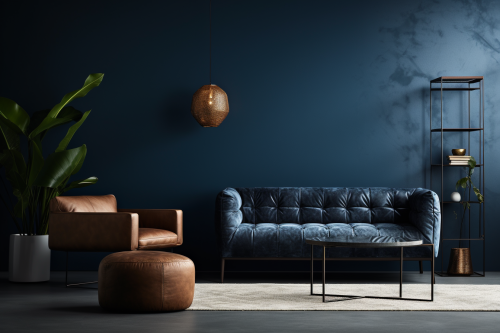photo of a livingroom, dark blue, natural lighting, editorial, professional photography, minimal background --v 5.2 --aspect 3:2