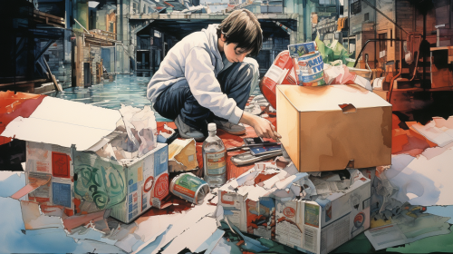 1980s. Create a scene of a person unwrapping a product with layers of excessive packaging, highlighting the wastefulness of consumerism Highly detailed, --ar 16:9 --v 5.2