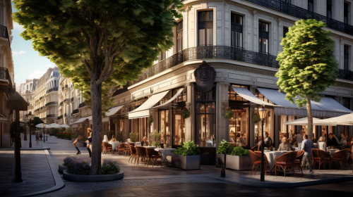 The design of the boulevard is a long and wide street on both sides of which are 20 restaurants and restaurants on the sidewalks. It includes a number of shops, outdoor restaurants, and a two-story restaurant in white, and is traversed by whistling supercars, so that the designs and designs are the first store for the Christian Dior brand, and in the adjacent outdoor area, such as on the sidewalk. There is Café Dior, and after it is a Lamborghini car showroom, and outside on the sidewalk is a Lamborghini restaurant, and after that is a carpentry shop for the Versace brand, and after that is a Versace restaurant on the sidewalk, and after that is a showroom and a Bugatti restaurant, and I want the logos of the brands to appear, and there are supercars driving in front of the sidewalk. Stores ,Realistic view, taken with DSLR. --ar 16:9