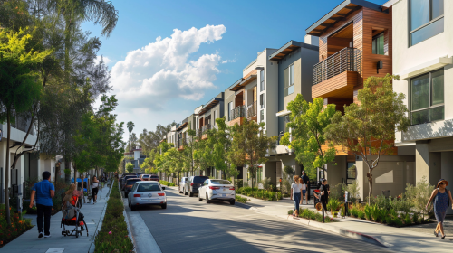 a beautiful, vibrant los angeles community with mulit-unit residences, neighbors in their early 20s outside, realistic --ar 16:9 --v 6.0