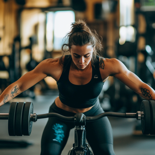 A person engaging in a balanced physical training routine to improve motorcycle riding performance. The scene should show a gym setting where the individual is performing both strength training exercises (like lifting weights or using resistance bands) and flexibility exercises (such as stretching or yoga). The focus should be on the combination of exercises, illustrating the importance of both strength and flexibility for enhancing riding skills. Include a motorcycle training area in the background to emphasize the connection between physical fitness and riding performance.