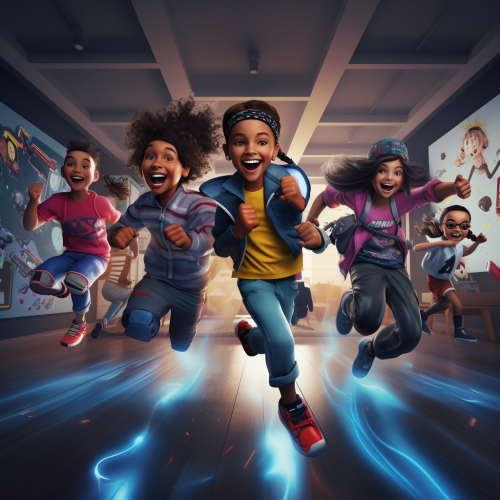 5 children, boys and girls, playing chase in an esport training room, having fun, physically active, realistic, 8k
