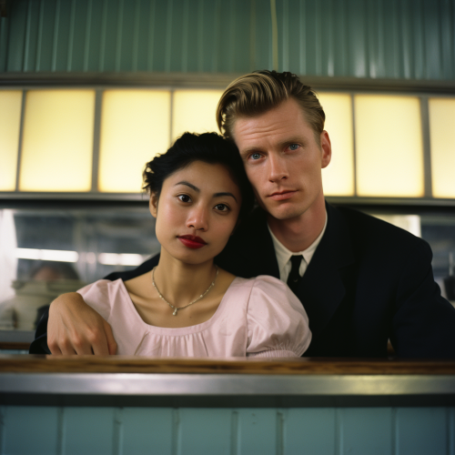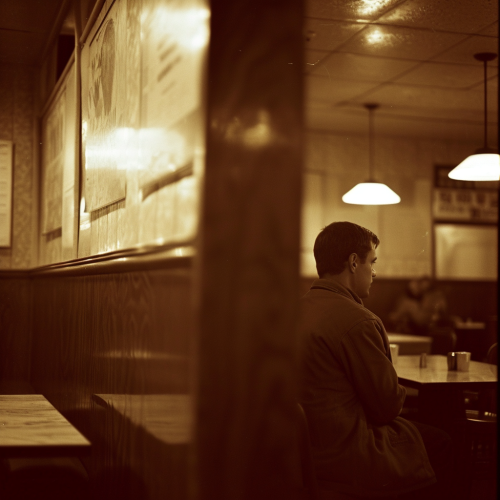 image capturing an intimate moment between two people, a young man and a young woman, sitting across from each other in a cozy booth at a classic diner. The lighting in the scene is warm and soft, likely from the early morning sun streaming through the large windows behind them, creating a gentle, nostalgic glow. The couple is engaged in conversation, their faces lit by the natural light, adding to the sense of connection between them. They both have coffee cups in front of them, and the table holds a few simple items like a sugar container and a napkin dispenser, emphasizing the unpretentious, everyday setting. The diner itself has a retro feel, with a polished metal-edged table and upholstered seats. The background outside the window shows a parking lot with a few cars, and some indistinct buildings, likely in a suburban or small-town setting. The overall atmosphere of the image is one of quiet, reflective intimacy, capturing a candid moment of connection in a timeless, familiar setting. The lighting and composition create a serene and nostalgic mood, emphasizing the simplicity and depth of the interaction between the two individuals.