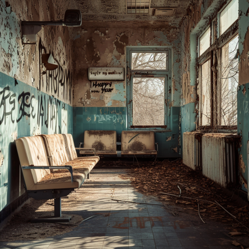 Creepy Abandoned hospital, The team screams for the photo "happy new year" - horror - cool color tones: shot on a Sony mirrorless camera, DSLR, 50mm lens f/2.8, ultra-detailed, 8k --v 6.0