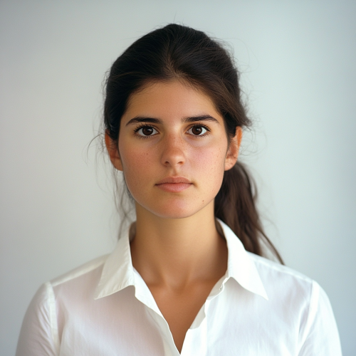 A photograph of the frontal shot of a young woman with dark brown hair, wearing a white shirt in a courtroom setting. She is facing forward and looking straight ahead at the camera, The background color should be white --v 6.1 --s 50 --style raw
