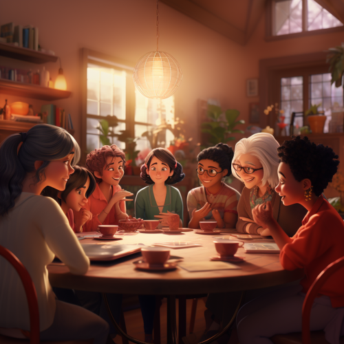 screenshot from a movie, illustration, a diverse group of young and old women, around a table, chatting, warm