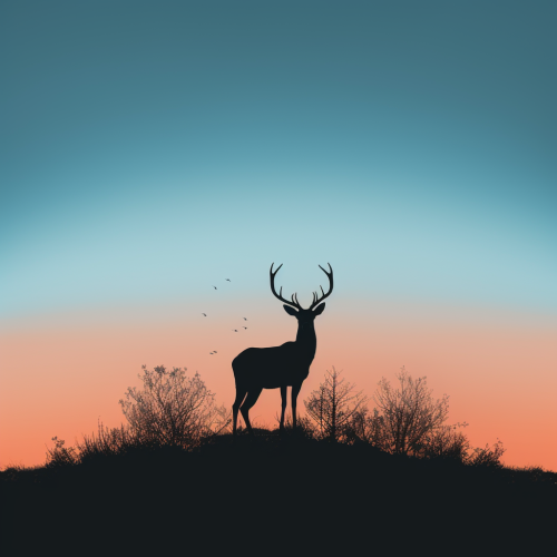 Silhouette of a majestic deer in the wild, high contrast against twilight sky, minimalist style, Canon EOS R5, icon design
