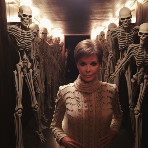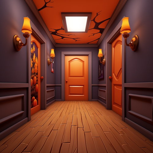 A long dark hallway, there are bones of every description set into the tunnel's cavernous wall and they glisten with a shiny black residue. Mosaics of spinal columns, distended ribs and intricate geometrical spirals of knuckle bones shimmer in the dim firelight. At the end of the hallway lies a door.