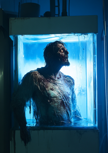 Cinema still, a zombie kept in a tank of fluid inside of a creepy laboratory, blue tinted lights, cinematic lighting, dirty, gritty, shot with RED camera, volumetric lighting --ar 5:7 --s 50