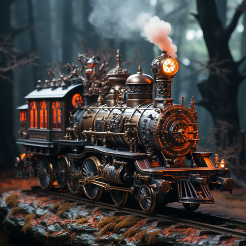 A mysterious Halloween-themed steam engine chugging through a dense, fog-covered forest, its carriages adorned with eerie lights and shadowy figures, with looming trees and twisted branches creating an ominous atmosphere, Sculpture, using a mix of metal and wood, enhanced with LED lights for an eerie glow, --s 750 --v 5.2