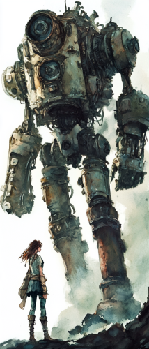 A female adventurer standing with her large steampunk style construct companion. Dark fantasy setting. Watercolor art style. Mood is eerie and ethereal. Partial watercolor background with some white space. --ar 3:7