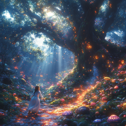 A creepy atmosphere with dwarves swarming at the feet, in a dark forest where only a part of the ground is illuminated by sunlight. Under a large willow tree, a bright light shines, with eerie-colored moss and fern plants, and brightly glowing rainbow-colored mushrooms covering the ground. A girl in white clothes reaches out her hand to a beam of light --s 750